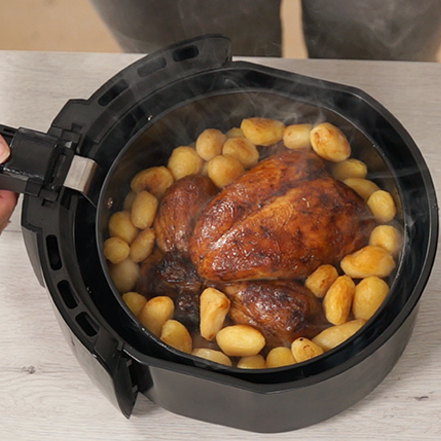 The top fan lets hot air circulate inside the pan throughout the cooking process and also allows a wide range of dishes to be prepared evenly, without the need to add oil.